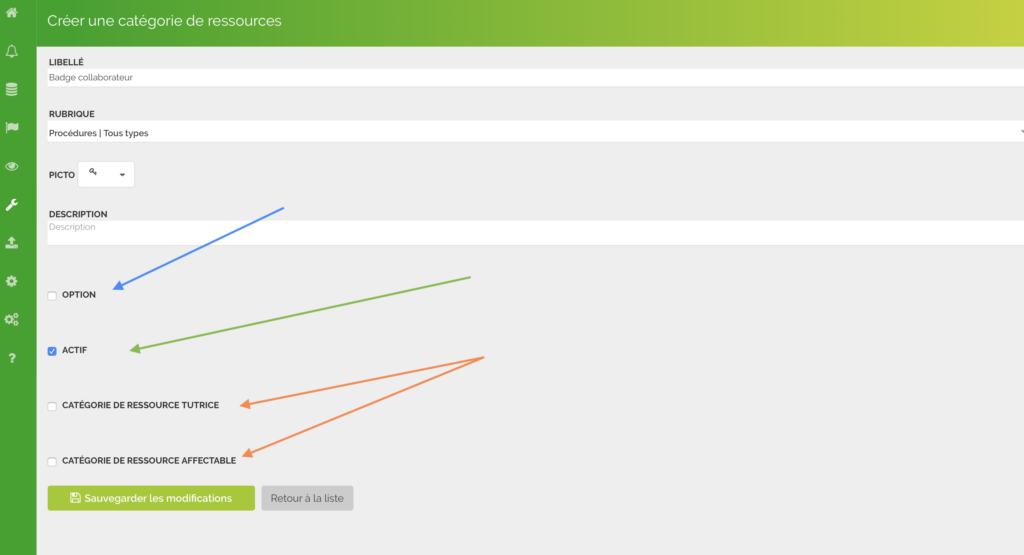 Cliquez sur option UNIQUEMENT si la catégorie deressources doit être une option d’une autre catégorie deressources. Ex HAYON est toujours une option d’un véhicule ( si Option est cochée voir comme relier un Cat de ressources en OPTION à la catégorie principale )