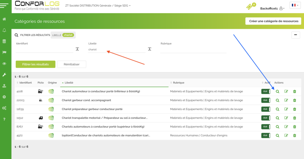 Cliquez sur la loupe pour ouvrir la fiche de la Catégorie de ressources Flèche BLEUE