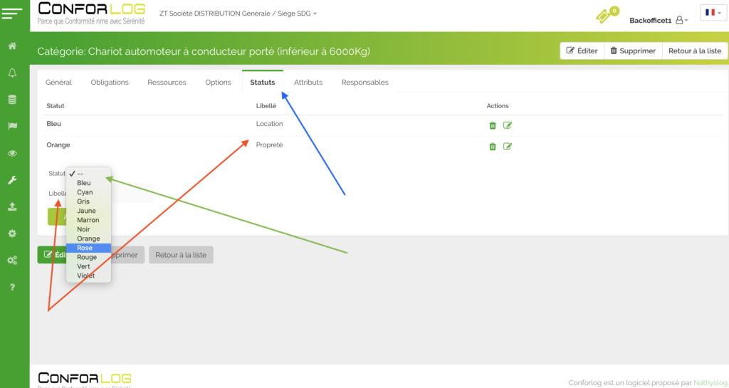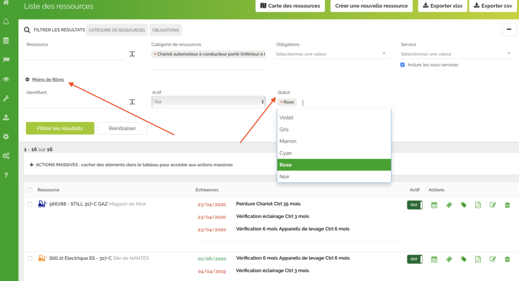 Définition : il est possible d’associer un code couleur à un statut d’une catégorie de ressources définie, et ainsi permettre un filtrage complémentaire