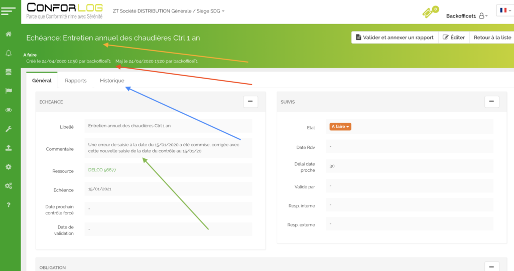 Attention cette opération doit rester exceptionnelle : elle annule la validation du ou des contrôles associé(s) au rapport, supprime le document qui était associé et remet les anciennes échéances en place