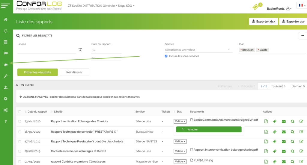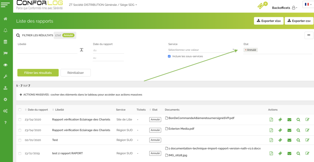 Pour rechercher les rapports annulés : Filtrez dans Etat le critère annulé