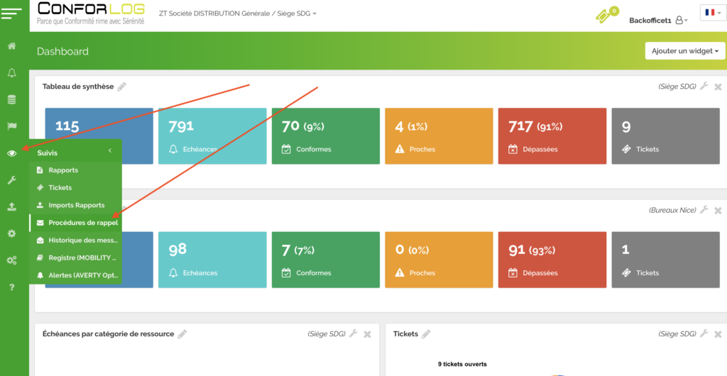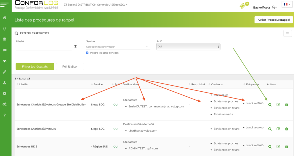 Cliquez bouton ‘ Créer Procédure rappel ‘ Barre verte du haut