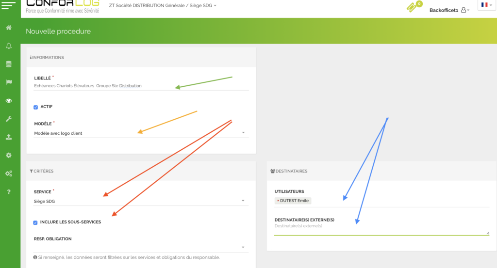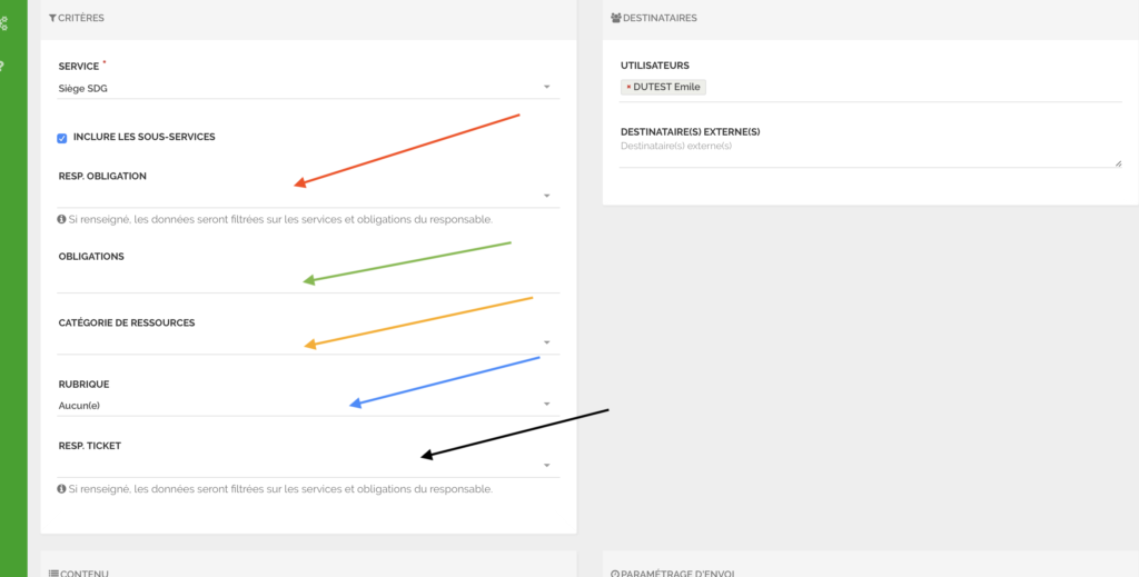 Flèches BLEUES compléter obligatoirement un destinataire : soit UTILISATEUR(S) ou Destinataire(s) EXTERNE(S)