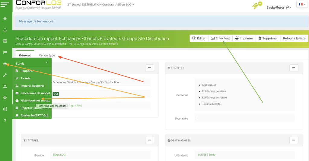 Cliquez sur envoi test pour expédier immédiatement le mail Flèche VERTE