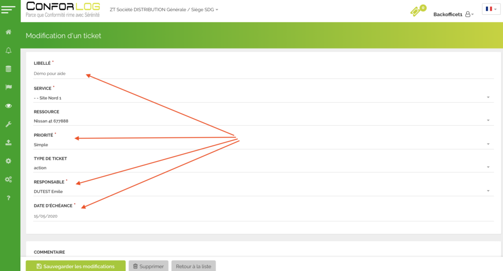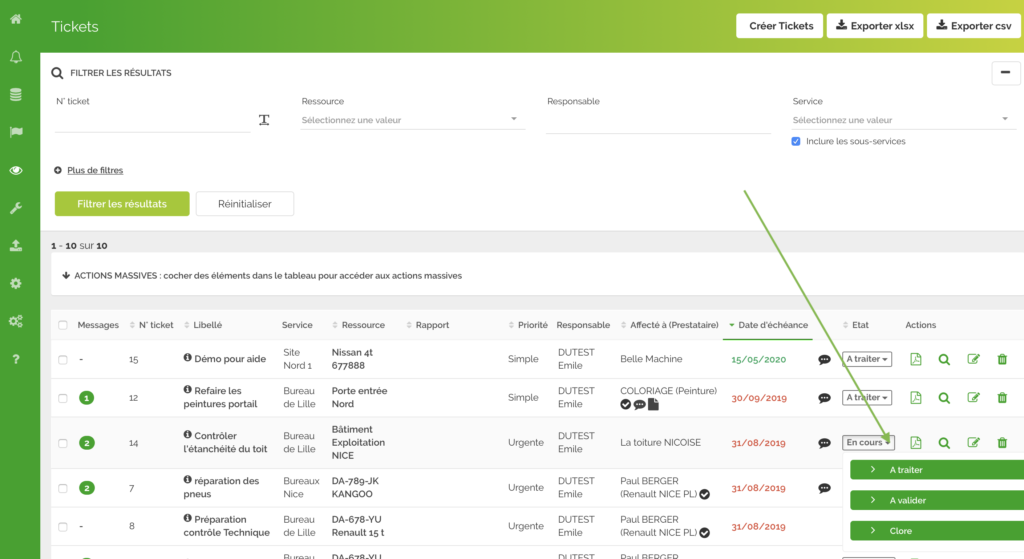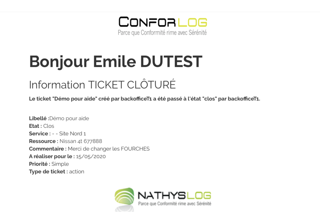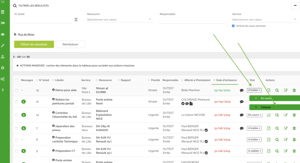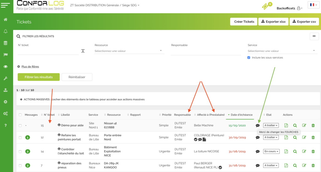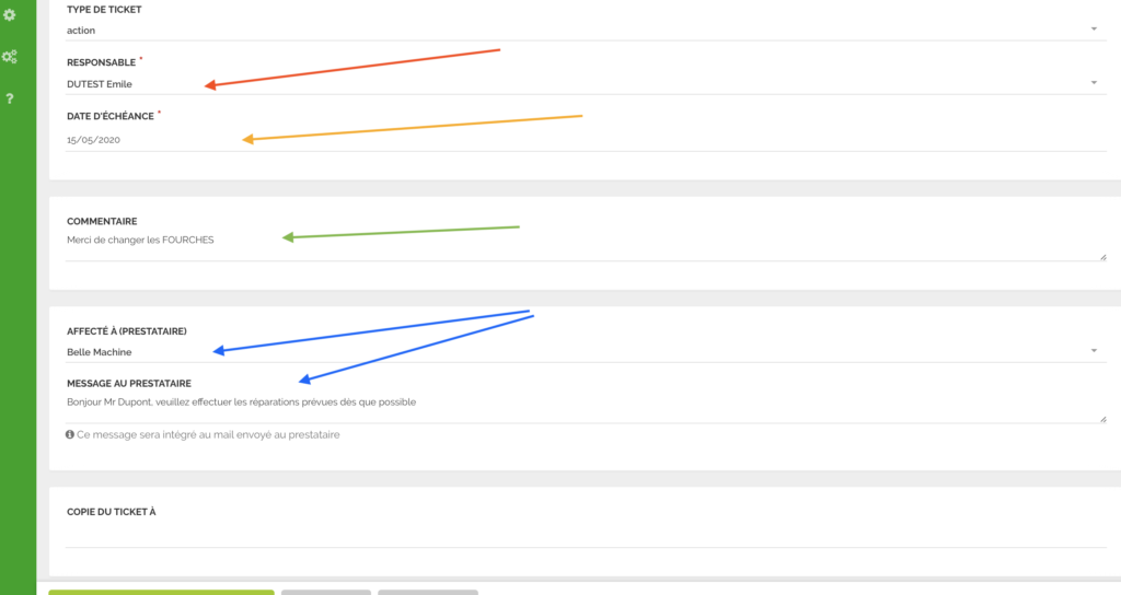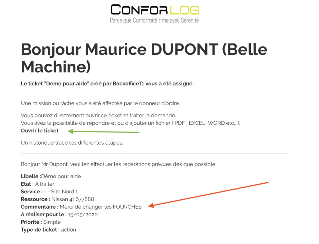 Il est possible d’associer un prestataire, un mail est généré qui contient Flèche VERTE un lien HTTPS ( sécurisé) qui permettra au prestataire de traiter le ticket : répondre, joindre un devis , un document , créer un fil de discussion.
